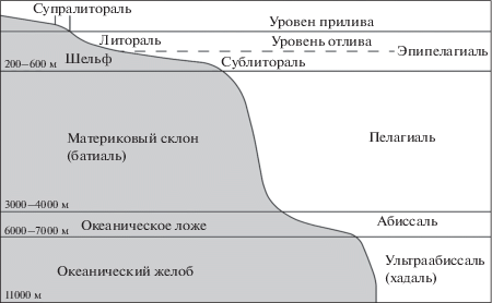 Иной тип вертикальной зональности в море. Наиболее крупными подразделениями тут являются: шельфовая зона – продолжение континентальной плиты под уровнем моря до глубин 200–600 м; материковый склон (батиаль) – от 200–600 до 3000–4000 м; ложе океана (абиссаль) – от 3000–4000 до 6000–7000 м. На это деление накладывается более дробное. Выделяется, например, приливо-отливная зона (в русской литературе – литораль, а в англоязычной – intertidal zone, поскольку под литоралью западные авторы понимают всю эвфотическую зону, примерно до 200 м). Выше приливо-отливной зоны располагается зона заплеска, увлажняемая морскими бризами (супралитораль). Эвфотическая зона обычно называется сублиторалью (не путать с супралиторалью), а шельфовая зона, расположенная глубже нижней границы эвфотической зоны, называется циркалиторалью. Если в пределах шельфа имеются впадины, характеризующиеся батиальными глубинами, эти акватории называются псевдобатиалями. На материковом склоне могут быть углубления с абиссальными глубинами – псевдоабиссаль. На океаническом ложе могут быть возвышенности с батиальными глубинами – талассобатиаль. Наконец, система желобов с глубинами до 11 000 м, особенно хорошо выраженными вдоль восточных берегов Азии, называется ультраабиссаль (у отечественных авторов), или хадаль (у западных авторов) (рис. 2).