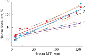 Взаимосвязь между количеством пользователей мобильных телефонов в России и возрастанием общего числа зарегистрированных больных злокачественными новообразованиями (1), больных опухолями головного мозга и других отделов центральной нервной системы (2) и онкологических больных опухолями лимфатической и кроветворной тканей (3). По оси абсцисс – количество пользователей мобильных телефонов (Sim-карт, млн); по оси ординат – процент возрастания числа больных с 1998 (принято за 100%) по 2007 гг.