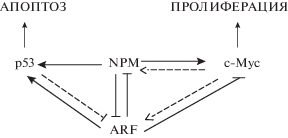 Онкогенный c-Myc рекрутирует ARF, что приводит к активации р53 и апоптозу посредством ингибирования Mdm2. Кроме того, ARF может связываться с c-Myc и опосредует р53-независимый апоптоз. При взаимодействии В23 и с-Myc активируется клеточная пролиферация и трансформация. В зависимости от баланса уровней экспрессии указанных белков наступает или апоптоз или злокачественная трансформация (Li et al., 2008).