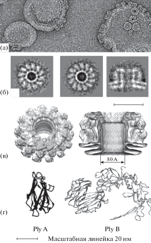 Плевротолизины: поры на липосомах и структуры мономеров (по: Lukoyanova et al., 2015). (а) – криоэлектронная микрофотография пор на липидных монослоях; (б) – усредненные 12- и 13-мерные поры и их сагиттальный вид; (в) – трехмерная реконструкция поры; (г) – трехмерные структуры плевротолизинов А и В.