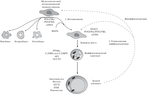 Ранние исследования на культурах фибробластов показали, что для инициации их дифференцировки in vitro (стадии детерминации) достаточно связывания BMP-2 и BMP-4 со своими рецепторами для активации транскрипционного фактора SMAD4 (Huang et al., 2009). Активированный SMAD4, в свою очередь, стимулирует транскрипцию PPARγ – главного регулятора адипогенеза. С другой стороны, в адипогенных фибробластах была обнаружена повышенная экспрессия еще одного транскрипционного фактора – Zfp423, который увеличивал чувствительность фибробластов к проадипогенным стимулам BMP (Gupta et al., 2010). При этом экспрессия Zfp423 требуется для образования подкожного жира у плода, но не является необходимой для образования висцерального жира при высоколипидной диете (Shao et al., 2016; Hepler et al., 2017). Были выявлены и многие другие факторы, направляющие дифференцировку фибробластов на путь адипогенеза, однако все еще остаются невыясненными способы активации и регуляции экспрессии этих факторов.