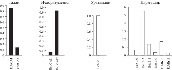 На рис. 3 показаны доли вариантов cytb-гаплотипов в выборках A. oeconomus из исследуемых материковых популяций. Выборки полевок-экономок из окрестностей г. Магадан, пос. Ола и пос. Атарган состоят из особей EcbСА- и EcbBr-генетических линий.