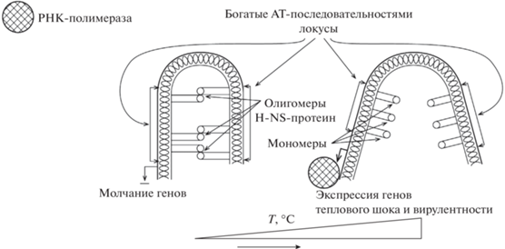 Кроме того, ассоциированный с суперспирализацией эффект усиливают гистон-подобные нуклеоид-структурирующие белки H-NS (histone-like nucleoid-structuring protein), экспрессируемые грамотрицательными бактериями (рис. 1) (Tendeng, Bertin, 2003; Grainger, 2016; Fitzgerald et al., 2020). Связываясь с богатыми по содержанию АТ‑пар локусами петель суперспирализованной ДНК (общий признак промоторов генов (Lucchini et al., 2006; Rajewska et al., 2012)) и образуя олигомеры высшего порядка, H-NS воспрещает тем самым доступ РНК-полимеразы к промоторам генов (Madrid et al., 2002; Ono et al., 2005; Shahul Hameed et al., 2019). H-NS подавляет экспрессию генов вирулентности грамотрицательных бактерий при температуре среды вегетирования ниже 37°С (Dame et al., 2001; Picker, Wing, 2016; Shahul Hameed et al., 2019).