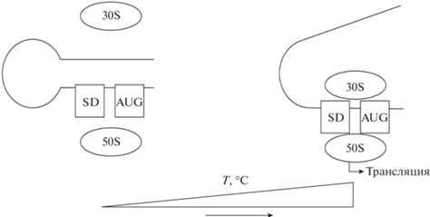 РНК-термометр – другой тип бактериальных термосенсоров – представляет собой контрольный элемент полимерной цепочки нуклеозидфосфатных звеньев, локализованный в 5′-нетранслируемом регионе мРНК, обеспечивающий реализацию стресс-реакции и экспрессию факторов вирулентности при повышении температуры среды вегетирования условно-патогенных микроорганизмов (рис. 2) (Kortmann, Narberhaus, 2012; Loh et al., 2018; Twittenhoff et al., 2020). Данный контрольный элемент – последовательность Shine–Dalgarno (SD) – сайт связывания молекул мРНК с рибосомами прокариот, расположенный обычно на расстоянии около десяти нуклеотидов от стартового кодона AUG (триплет аденин–урацил–г-уанин) (Shine, Dalgarno, 1975; Kapp, Lorsch, 2004; Li et al., 2012). Взаимодействуя с консенсусным локусом другого участка мРНК, последовательность Shine–Dalgarno формирует шпилькообразные структуры (Shapiro, Cowen, 2012), препятствующие взаимодействию с анти-SD рибосомных РНК, и таким образом блокирует трансляцию данной мРНК (Abolbaghaei et al., 2017). Повышение температуры дестабилизирует взаимосвязь SD с консенсусным локусом РНК, что обеспечивает доступность стартового кодона AUG мРНК для 30S- и 50S-субъединиц рибосом и, следовательно, инициирует трансляцию (Kaminishi et al., 2007; Steinmann, Dersch, 2013). Бактериальные РНК-термосенсоры обеспечивают быстрое и надежное реагирование прокариот на изменение температуры среды вегетирования, поскольку процесс адаптивного реагирования не требует участия сигнальных субстанций или синтеза de novo каких-либо молекул-посредников.