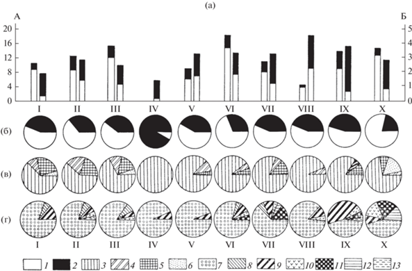 Биоценотические группировки мелких млекопитающих Карельского Приладожья. I – сосняки лишайниковые; II – сосняки-зеленомошники; III – ельники-зеленомошники; IV – ельники заболоченные; V – смешанные хвойно-лиственные леса; VI – спелые лиственные леса; VII – лиственное мелколесье; VIII – вырубки в разной степени зарастания; IX – луга и другие сельскохозяйственные угодья, Х – окраины болот. (а) – средняя численность землероек (I) и грызунов (II) по данным учетов канавками (левый столбик) и ловушками (правый столбик). По оси абсцисс – биотопы, по оси ординат А – число зверьков на 10 канавко-суток, по оси ординат Б – число зверьков на 100 ловушко-суток; (б) – доля землероек – (1) и полевок (2) в сборах мелких млекопитающих, % от общего числа отловленных зверьков; (в) – соотношение видов в отлове землероек, % от общего числа отловленных зверьков данной группы: 3 – обыкновенная бурозубка, 4 – средняя бурозубка, 5 – малая бурозубка, 6 – водяная кутора; (г) – соотношение видов в отлове мышевидных грызунов, % от общего числа отловленных зверьков данной группы: 7 – рыжая полевка, 8 – красная полевка, 9 – темная полевка, 10 – лесная мышовка, 11 – полевка-экономка, 12 – мышь-малютка, 13 – лесной лемминг.