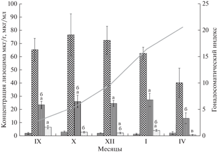 Концентрация лизоцима в органах, кроме печени, не была стабильной в разные месяцы. В почках, несмотря на двукратную разницу между максимальными и минимальными значениями в зимний и весенний периоды, различия были не достоверные, что вероятно связано с чувствительностью критерия U для малочисленных выборок. В апреле, при наиболее высоких ГСИ, концентрация лизоцима в почках, селезенке и сыворотке была минимальная. В сезонном аспекте, с осени до весны, при значительном увеличении ГСИ в сыворотке выявлено максимальное 6-кратное снижение концентрации фермента (рис. 2).