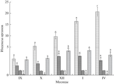 За период наблюдений наиболее значимые изменения произошли в гонадах, соматический индекс которых увеличился в 7 раз. В зимние месяцы и апреле индекс печени также был значительно увеличен. Размер селезенки варьировал в меньшей степени, а у почек оставался неизменным. В совокупности направленность изменений относительной массы трех органов иммунной системы (СИО) повторяла изменения печени, как наиболее крупного органа (rs = 0.98) (рис. 1).