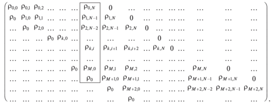 $\left( {~~\begin{array}{*{20}{c}} {{{\rho }_{{0,0}}}}&{{{\rho }_{{0,1}}}}&{{{\rho }_{{0,2}}}}& \ldots &{{{\rho }_{{0,N}}}}&0 \\ {{{\rho }_{0}}}&{{{\rho }_{{1,0}}}}&{{{\rho }_{{1,1}}}}&{{{\rho }_{{1,2}}}}& \ldots &{{{\rho }_{{1,N}}}} \end{array}} \right),$(18)