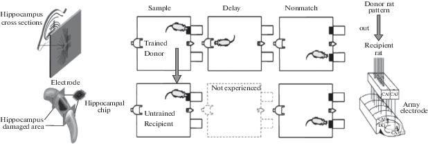 Микрочип связан с гиппокампом двумя пучками электродов, которые расположены по разным сторонам поврежденной области данной мозговой структуры. Один пучок электродов регистрирует электрическую активность других отделов мозга, другой – электрические сигналы, выработанные микросхемой нейропротеза, которые направляются обратно в мозг, обходя, таким образом, поврежденный участок мозга и восстанавливая утраченные функции гиппокампа. Позднее, исследователи [27, 34] на двух группах подопытных крыс показали возможность передачи записанной на нейрочип информационного паттерна нейрональной активности гиппокампа от животных, обученных выполнять задачу отсроченного выбора предложенного образца (DNMS memory task), необученным крысам – реципиентам, которые в результате переноса записанной информации начинали с успехом выполнять предложенный поведенческий тест. В настоящее время исследователи планируют тестировать описанные нейропротезы гиппокампа в опытах на обезьянах, с целью проверки их эффективности для последующего применения на людях с органическими повреждениями данной структуры мозга. Следует отметить, что кроме “чипирования” гиппокампа группа исследователей, используя сходные методологические подходы, проводят эксперименты на животных по созданию искусственной модели мозжечка [43, 50]. Отдельные исследователи допускают возможность осуществить крупномасштабное моделирование мозговых структур, включая полную эмуляцию головного мозга, что, по их мнению, будет означать полное сохранение и/или усиление церебральных функций обработки информации [30].