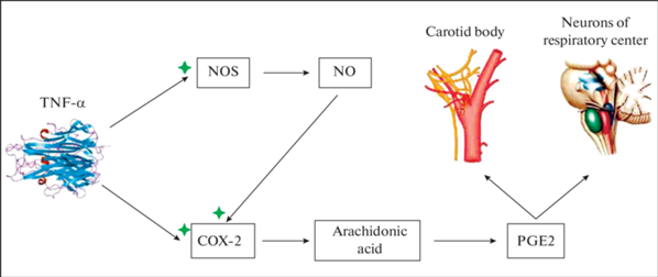 Анализ данных литературы указывают на возможность участия провоспалительных цитокинов в модуляции хеморефлекторного контроля дыхания не только в патологических, но и в нормальных физиологических условиях, посредством активации конститутивных форм NOS, нейрональной и эндотелиальной, в гломусных клетках каротидных тел [85]. Однако в условиях цитокинового шторма роль оксида азота в модуляции дыхательных хеморефлексов может резко возрастать, так как провоспалительные цитокины способствуют усилению макрофагального синтеза индуцибельной NO-синтазы (iNOS). При этом синтез оксида азота может в сотни раз превышать синтез, осуществляемый конститутивными изоформами фермента. В этом случае действие фермента iNOS перестает быть физиологическим, так как высокие дозы NO токсичны для клеток.