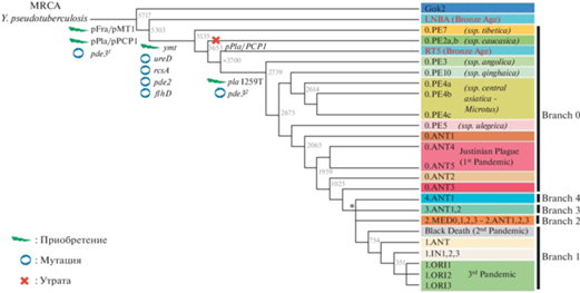 Среди ныне существующих геновариантов, согласно молекулярным выводам, базальные позиции на филогенетическом дереве Y. pestis занимают геноварианты кластера 0.PE, образованного возбудителями биовара Pestoides, который включает штаммы, вирулентные для Microtina, но не вирулентные или слабовирулентные для сусликов, сурков, песчанок и человека. Набор активных генов у этих геновариантов богаче, чем у археологических находок [22, 24], что, казалось бы, соответствует идее о происхождении биовара Pestoides от археологических форм. На основании описанных молекулярных и генетических свойств экологически не детерминированные “археологические” находки ДНК чумного микроба из человеческих останков жертв древних пандемий считают принадлежащими вымершим переходным формам Y. pseudotuberculosis / Y. pestis. “Археологическую” ДНК чумного микроба из останков диких грызунов или синантропных крыс пока выявить и изучить не удалось.