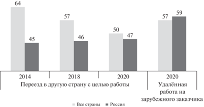 Глобальные интернет-опросы, проводимые международной консалтинговой компанией “BCG” примерно в 190 странах и охватывающие порядка 200 тыс. человек, среди которых преобладают люди в возрасте 25–49 лет с дипломом бакалавра или магистра, свидетельствуют об ослаблении намерений физической эмиграции в пользу виртуальной. По результатам этих обследований, в мире в целом доля лиц, желающих переехать за рубеж с целью работы (включая уже трудоустроившихся там), снизилась с 64% в 2014 г. до 57% в 2018 г., а затем – до 50% в 2020 г. (Эмиграционные намерения россиян были не столь сильны и относительно стабильны, вероятно, вследствие санкций западных государств.) В том же ковидном 2020 г. 57% всех опрошенных на планете хотели бы удалённо работать на иностранного заказчика, не являющегося резидентом страны их проживания, что заметно превышало долю лиц, желавших работать за рубежом, физически там находясь (50%) (рис. 1). Удалённая занятость особенно привлекательна для респондентов, имеющих опыт деятельности в области цифровых технологий и аналитики, а также в сферах ИТ и на инженерно-технологическом поприще. Наибольший интерес к трансграничной удалённой работе проявляли жители стран Латинской Америки и Тропической Африки (80–84% опрошенных), сталкивающиеся с серьёзными трудностями при иммиграции в страны Севера (рис. 2).