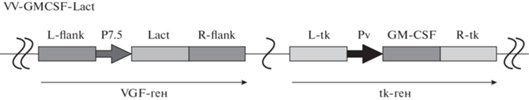 L-flank (слева) и R-flank (справа) – фрагменты генома вируса осповакцины, фланкирующие ген вирусного ростового фактора (VGF); Lact – ген лактаптина; P7.5, Pv – промоторы вируса осповакцины; L-tk (слева) и R-tk (справа) – последовательности генома VACV, штамм Л-ИВП, фланкирующие ген вирусной тимидинкиназы (tk); GM-CSF – ген ГМКСФ человека