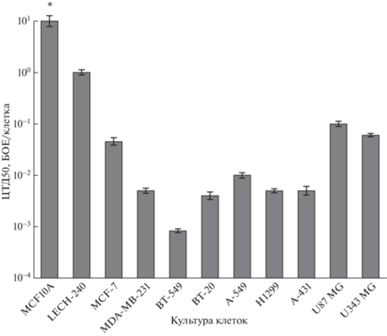 Культуры опухолевых клеток: MCF-7, MDA-MB-231, BT-549, BT-20 – рак молочной железы; A-549, H1299 – рак лёгкого; А-431 – эпидермоидная карцинома; U87 MG, U343 MG – глиобластома; культуры немалигнизированных (нормальных) клеток: MCF10А – эпителиоциты молочной железы; LECH-240 – диплоидные клетки лёгкого эмбриона человека; * – максимальная доза вируса 10 БОЕ/клетку не вызывала 50%-го токсического эффекта; БОЕ – бляшкообразующая единица; ЦТД50 – цитотоксическая доза, концентрация вируса, вызывающая гибель 50% клеток (чем больше значение ЦТД50, тем меньшей онколитической активностью обладает вирусный препарат в данной культуре клеток)