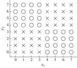С другой стороны, если на множестве допустимых значений признаков x1 и x2 ввести естественный порядок $ \cdots \preccurlyeq 0 \preccurlyeq 1 \preccurlyeq \cdots $), то решающие правила для обоих примеров становятся простыми. Пусть S = (a1, a2) – распознаваемый объект. Тогда решающее правило для первого примера: если (a1, a2) $ \preccurlyeq $ (3, 3) или (a1, a2) $ \succcurlyeq $ (4, 4), то S ∈ K1, иначе S ∈ K2. Решающее правило для второго примера: если (a1, a2) $ \preccurlyeq $ (x, 7 – x) для хотя бы одного x ∈ {0, 1, …, 7}, то S ∈ K2, иначе S ∈ K1.