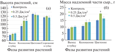 Дальнейшие исследования были направлены на изучение и сравнение влияния еще меньших доз УФБ-излучения на потенциальную продуктивность пшеницы по морфометрическим показателям. Подобная закономерность была нами обнаружена ранее при изучении воздействия малых доз импульсно-периодического рентгеновского излучения на качество семян и продуктивность пшеницы [16]. Так, сократив дозу УФО в 2 раза (до 0.25 Дж/см2) мы наблюдали увеличение значений по высоте растений и массе надземной части, которые были больше контроля почти на протяжении всей вегетации, максимальные значения массы надземной части в фазу цветения превышали контроль на 34% (рис. 1). Накопление биомассы в фазу цветения происходило, в основном, за счет прироста стеблей и колосьев. В опытном варианте 0.5 Дж/см2 также отмечены увеличения показателей высоты растений в фазу выхода в трубку и колошения, а надземная масса превышала контроль на всех этапах онтогенеза.