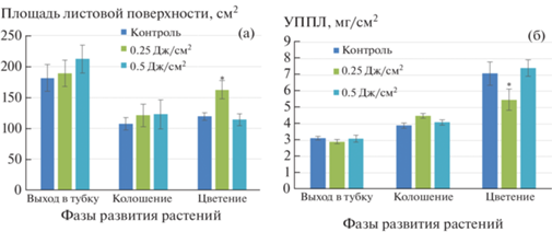 В растительном мире индивидуальные размеры и быстрота роста массы отдельных растений более тесно коррелируют с площадью листьев, чем с интенсивностью их работы [17]. Из рис. 2а видно, как пропорционально надземной части (рис. 1б) увеличивалась площадь листьев, наибольшие значения были отмечены в фазу выхода в трубку, затем ‒ за счет отмирания нижних листьев ‒ суммарная площадь ассимилирующей поверхности растений снижалась. Так, в варианте 0.5 Дж/см2 в фазу выхода в трубку отмечена тенденция к увеличению площади листьев, а в варианте 0.25 Дж/см2 в фазу цветения значения площади листьев превышали контроль на 36%.