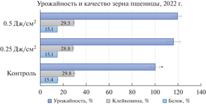 Полевые исследования 2022 г. показали, что урожайность зерна в опытных вариантах 0.25 и 0.5 Дж/см2 составила 289.1 и 298.0 г/м2, что превышает показатели в контроле на 15.9 и 19.5% соответственно, при этом качество зерна не снизилось: содержание белка во всех вариантах составило 15%, содержание клейковины изменялось незначительно – от 28.8 до 29.8% (рис. 3).