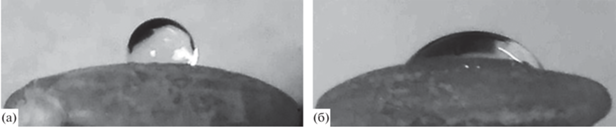 Капля воды, посаженная на поверхность необработанного (а) и обработанного холодной плазмой (б) рисового зерна.