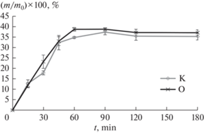 Для определения водопоглощения риса отбирали пять партий по 10 рисовых зерен на одно измерение. Измеряли начальную массу партии m0 и массу m после выдержки в течение определенного времени в дистиллированной воде комнатной температуры. Перед взвешиванием излишки воды с поверхности зерновок риса удаляли бумажной салфеткой. Водопоглощение рассчитывали по формуле: