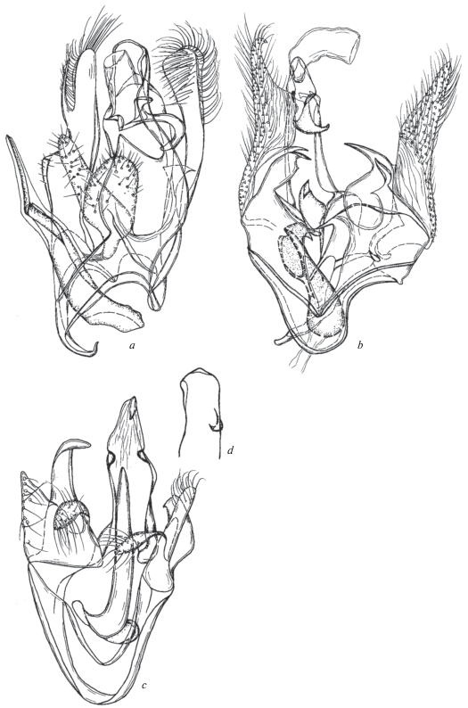 Photodotis Meyrick, гениталии самцов: a – Ph. decolorata sp. n.; b – Ph. aliena sp. n.; c, d – Ph. imperfecta sp. n. (a–c – общий вид, d – ункус сбоку).