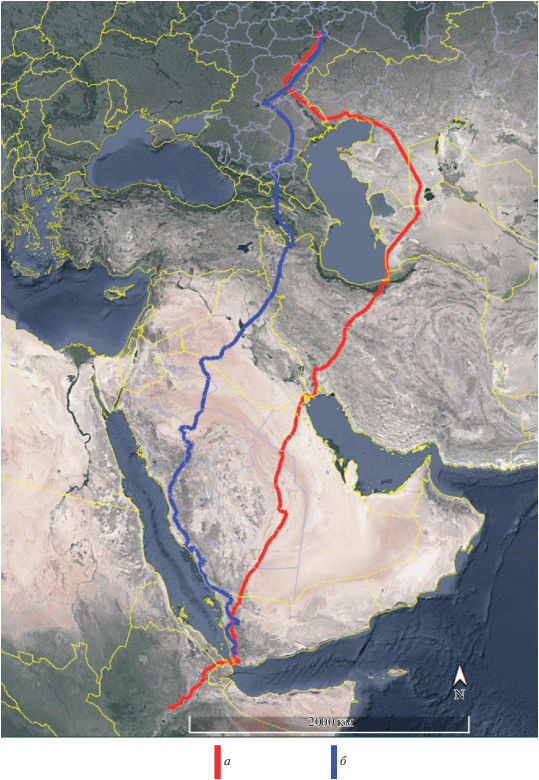 Сравнивая маршруты миграции помеченных орлов-могильников, можно выделить два основных миграционных направления: 1) к западу от Каспия – напрямую через Кавказ и 2) к востоку от Каспия – через плато Устюрт. Первое направление использует большинство орлов-могильников поволжской популяции (8 из 10 помеченных птиц). При этом выбор миграционного пути не определяется ни принадлежностью к той или иной гнездовой группировке, ни стереотипом гнездования, ни родственными связями птиц. В частности, в 2018 г. птенцы из одного выводка полетели разными путями (Филипп – через Кавказ, а Авралька – через Устюрт), однако районы их зимовки совпали (рис. 2).