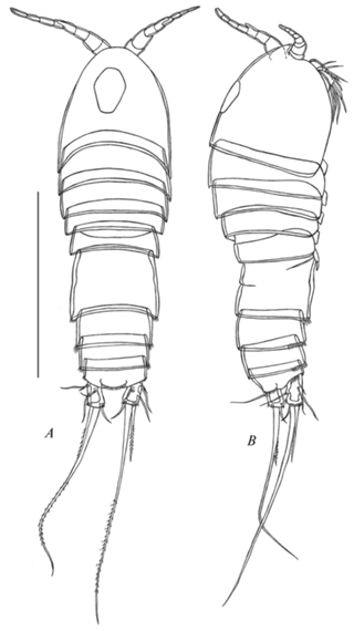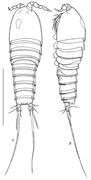 Canthocamptus latus, самка неотип: A – внешний вид, дорсально; B – внешний вид, латерально. Масштаб 400 мкм.