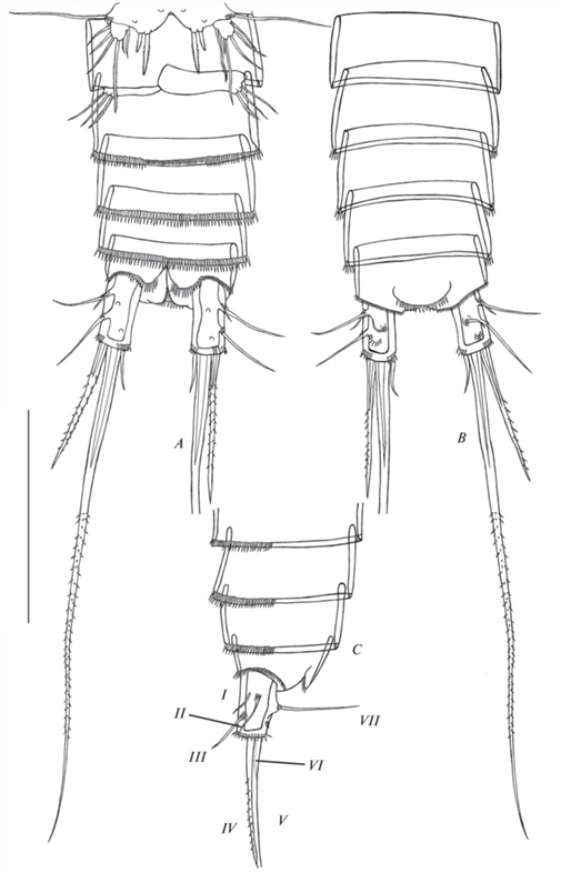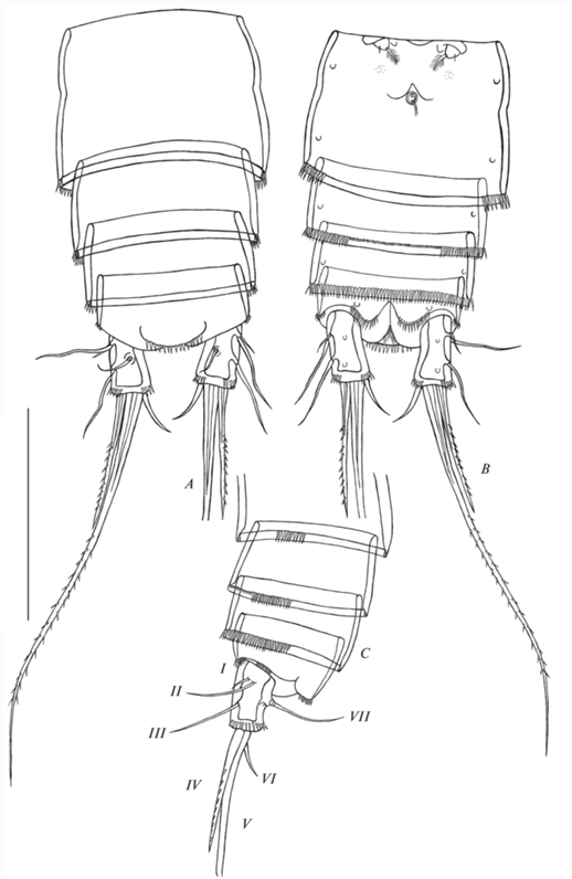 Canthocamptus latus, самец: A – абдомен, дорсально; B – абдомен, вентрально; C – часть абдомена, латерально: I–VII – фуркальные щетинки. Масштаб 200 мкм.