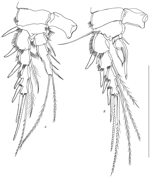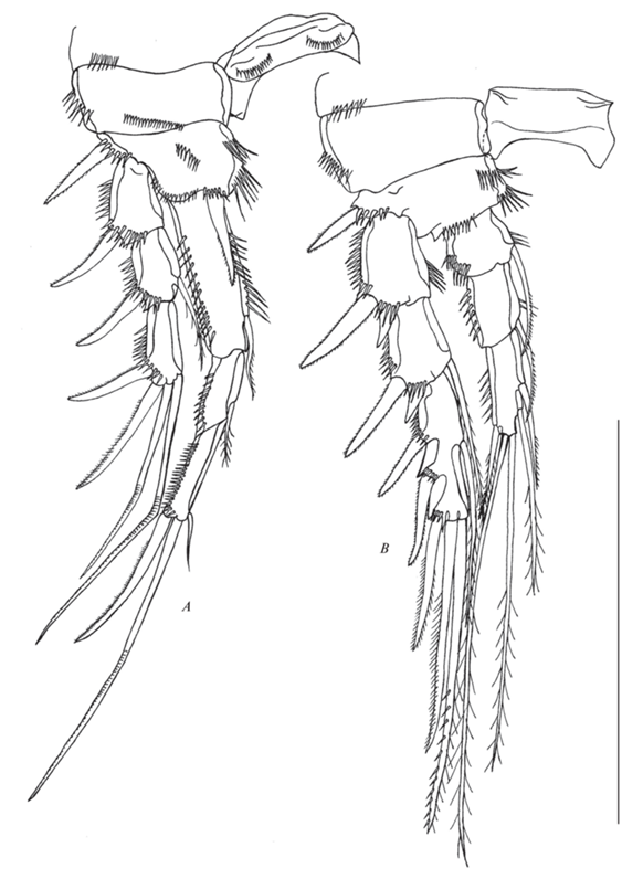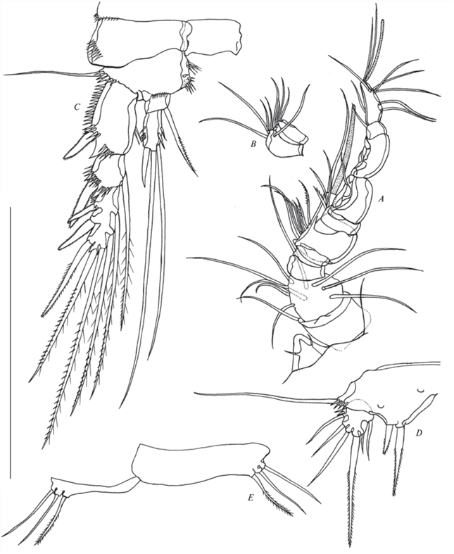Р5 (рис. 10A, 11B, 13D) медиально срощены, базиэндоподит и экзоподит разделены. Базиэндоподит с наружной щетинкой и коротким рядом наружных шипиков у ее основания. Эндоподальная лопасть меньше, чем у самки, с двумя оперенными шипами разной длины. Экзоподит с парой шипиков на наружном крае и шестью щетинками, из которых самая короткая вторая от внутреннего края.