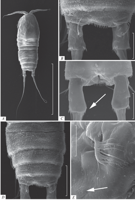 Canthocamptus latus, самка: A – внешний вид, дорсально; B – фурка, дорсально; C – фурка, вентрально: стрелкой показана гладкость внутреннего края; D – абдомен, дорсально; E – P6, стрелкой показаны ситовидные поры. Масштаб, мкм: A – 500; B–C – 50; D – 100; E – 20.