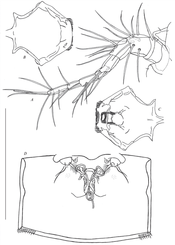 Canthocamptus latus, самка неотип: A – антеннула и рострум; B – ламбрум, внешняя сторона; C – ламбрум, внутренняя сторона; D – генитальное поле. Масштаб 200 мкм.