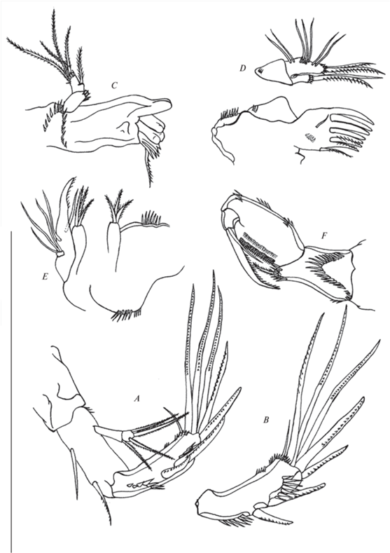 Максиллипеды (рис. 5F, 6A, 6D). Синкокса с оперенной щетинкой на дистальном выступе, и рядами шипиков. Базис немного больше синкоксы, с рядами шипиков на внутреннем и внешнем краях. Эндоподит несет мощный коготь с голой щетинкой у основания.