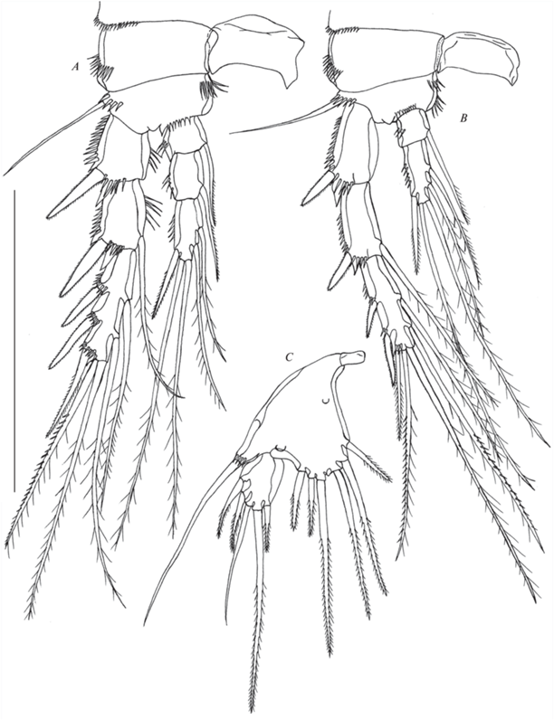 Р5 (рис. 8C). Интеркоксальный склерит очень маленький прямоугольный. Базиэндоподит и экзоподит отчетливо разные. Базиэндоподит вооружен шестью мелкооперенными щетинками, из которых первая, пятая и шестая от внутреннего края – самые короткие. Экзоподит немного длиннее внутренней лопасти базиэндоподита и несет 5 щетинок; вторая от внутреннего края – самая длинная, третья лишена оперения.