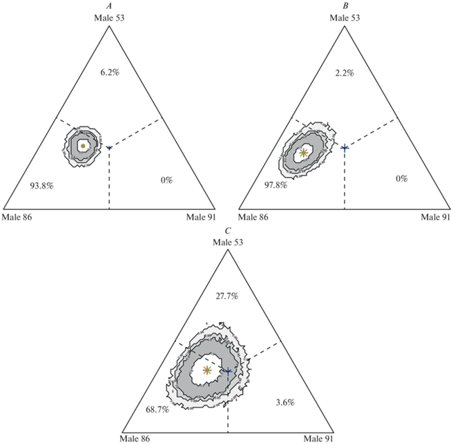 Индивидуальные предпочтения детенышей в выборе самцов: А – детеныш 116, B – детеныш 141, C – детеныш 142. Бутстрэп анализ. Приведены области, в которые укладываются 50, 90, 95 и 99% всех сгенерированных выборок. Синий крест на графике обозначает точку безразличия (точка, в которой нет предпочтения ни одного из самцов); зеленым крестом обозначена точка с координатами (xs, ys), полученная на основе реальных значений; красным – средняя точка предпочтения по бутстрэп методу. Пунктирными линиями обозначены границы областей, принадлежащих каждому из самцов.
