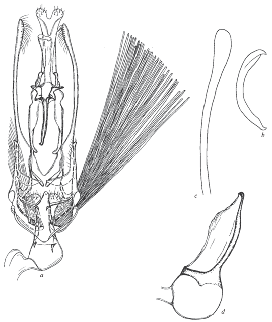 Helcystogramma jeffi sp. n., гениталии самца: a – общий вид снизу, b – медиальный склерит гнатоса, c – дистальная часть кукуллуса сбоку, d – эдеагус.