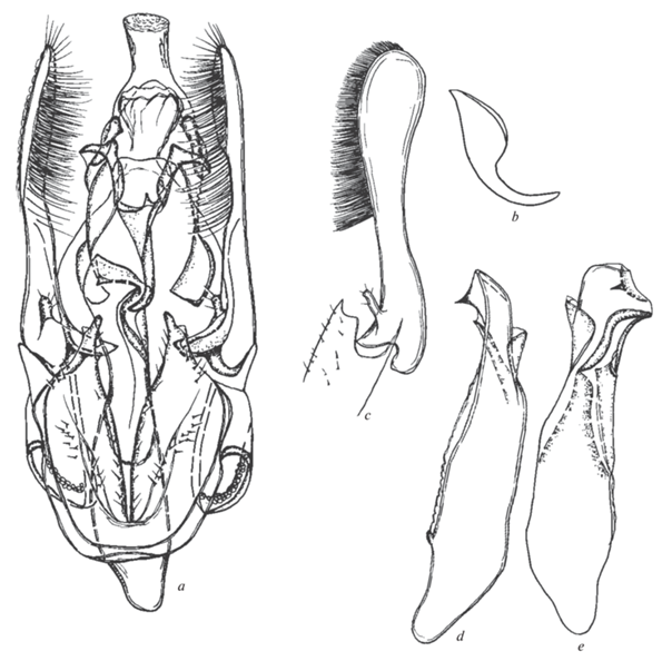 Гениталии самца (рис. 3a–3f). Ункус сравнительно небольшой, его прямо обрезанная вершина в виде овала с морщинистой скульптурой. Медиальный склерит гнатоса на длинных ветвях, крюковидный, широкий в проксимальной части и узкий в дистальной. Кукуллусы лопастевидные, обратноланцетовидной формы, слабо изогнутые дуговидно вверх, с внутренней стороны густо покрыты длинными щетинками. Базально кукуллусы с клиновидной лопастью, направленной медиально. Эти лопасти поддерживают эдеагус сверху. Ветви саккулусов маленькие, продолговатые, уплощенные. Юкста большая, сросшаяся с винкулумом, ее конусовидно суженные дистально ветви с зубцевидным уступом перед заостренной вершиной, поддерживают эдеагус снизу. Эдеагус большой, с перехватом в средней части, овальной базальной частью, лопастевидной вершинной частью с шиповидным отростком. Винкулум прямо обрезан, без выраженного саккуса, его узкие ветви срослись с паратегминальными склеритами в желобовидные структуры с пучком андрокониальных чешуек.