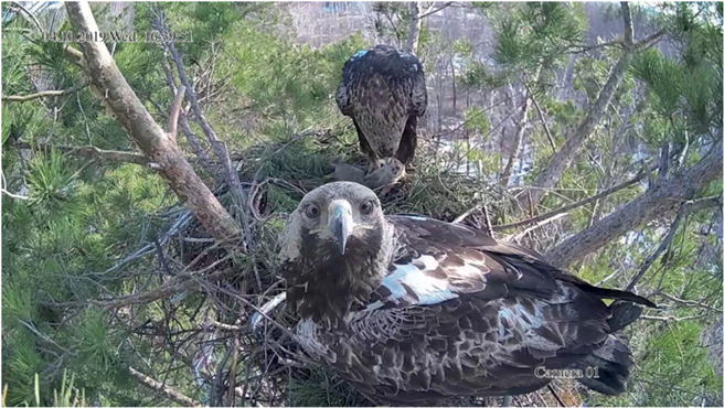 В каждый из трех исследуемых сезонов пара орлов-могильников откладывала по два яйца, однако в первые два сезона (2019 и 2020 гг.) младший птенец погибал на ранних стадиях (в возрасте 2 и 11 дней, соответственно), и только в 2021 г. орлы вырасти двух птенцов. Также следует отметить, что в 2021 г. на исследуемом гнезде сменилась самка, в то время как самец остался прежним.
