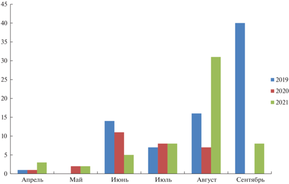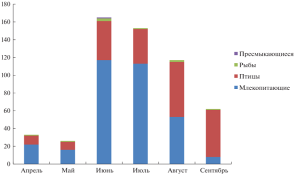 Интенсивность добычи кормовых объектов орлами-могильниками в гнездовой период имеет определeнную временнýю динамику, связанную с потребностями птиц в пище. В апреле и мае, в период брачного поведения, гнездостроительства и насиживания кладки, количество принесённых на гнездо кормовых объектов относительно невелико. В июне интенсивность добычи корма достигает максимальных значений, что связано с вылуплением к началу лета птенцов и необходимостью их регулярного кормления в первые недели жизни. В дальнейшем количество принесённых кормовых объектов остаeтся относительно высоким, но постепенно убывает от июня к сентябрю (рис. 3).