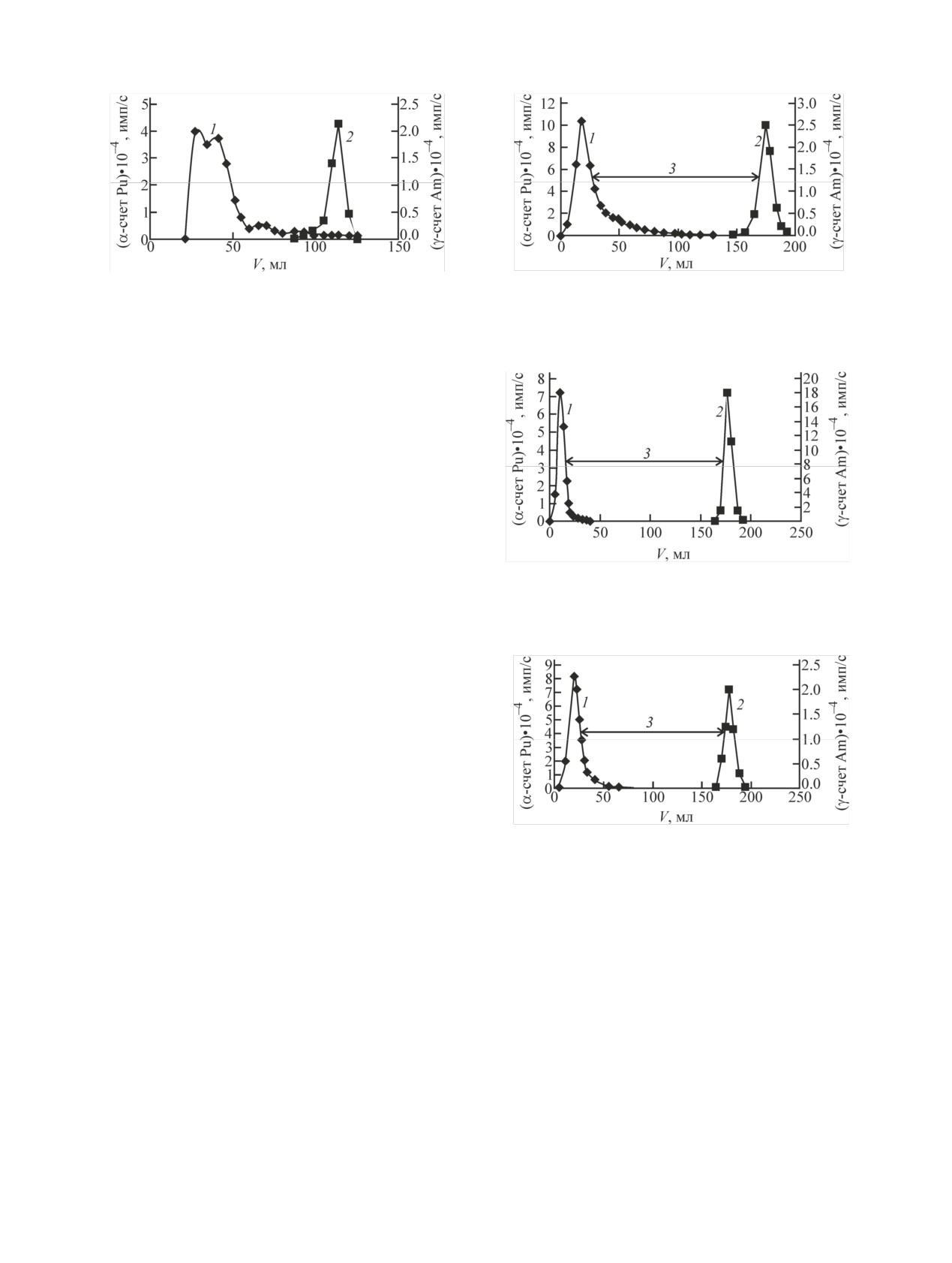 Рис. 4. Отделение Pu (1) от Am (2) на катионите в никелевой