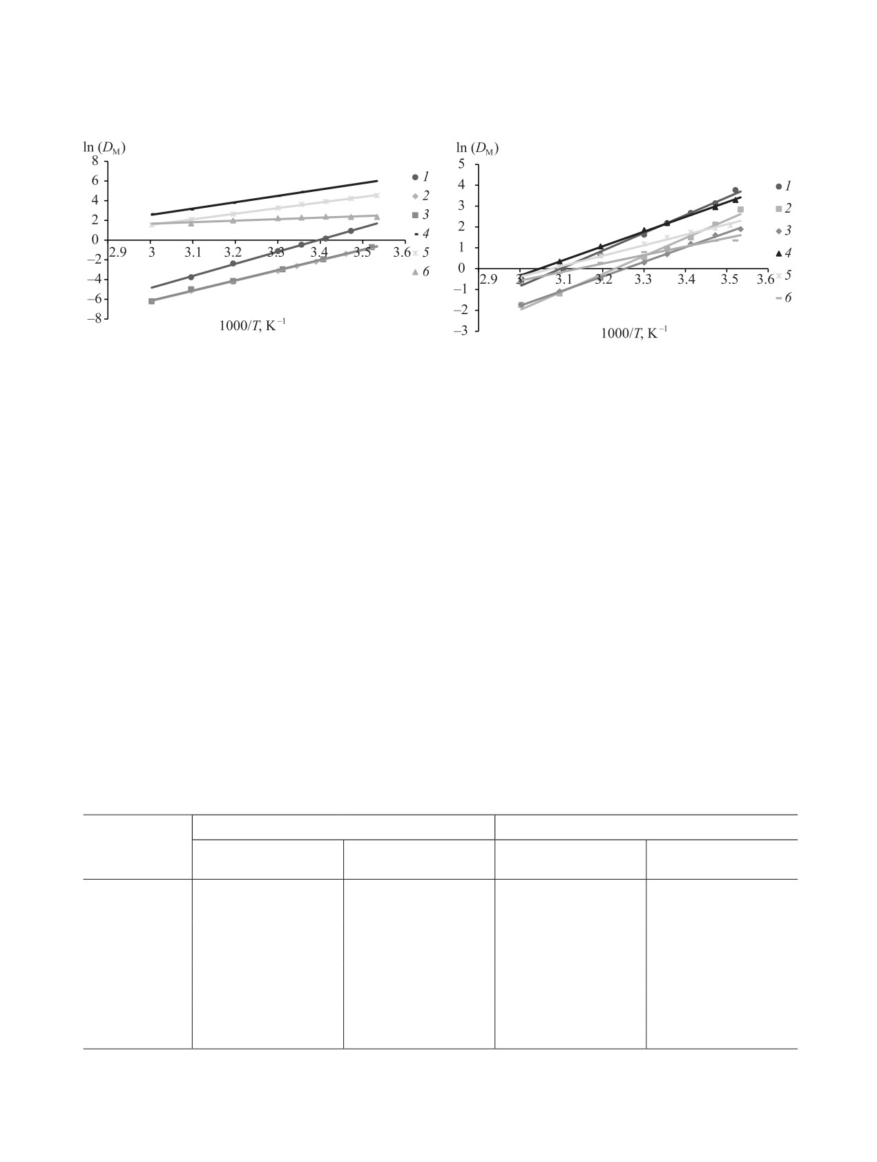 координатах ln(DM) - 1/T. Тангенсы углов наклона