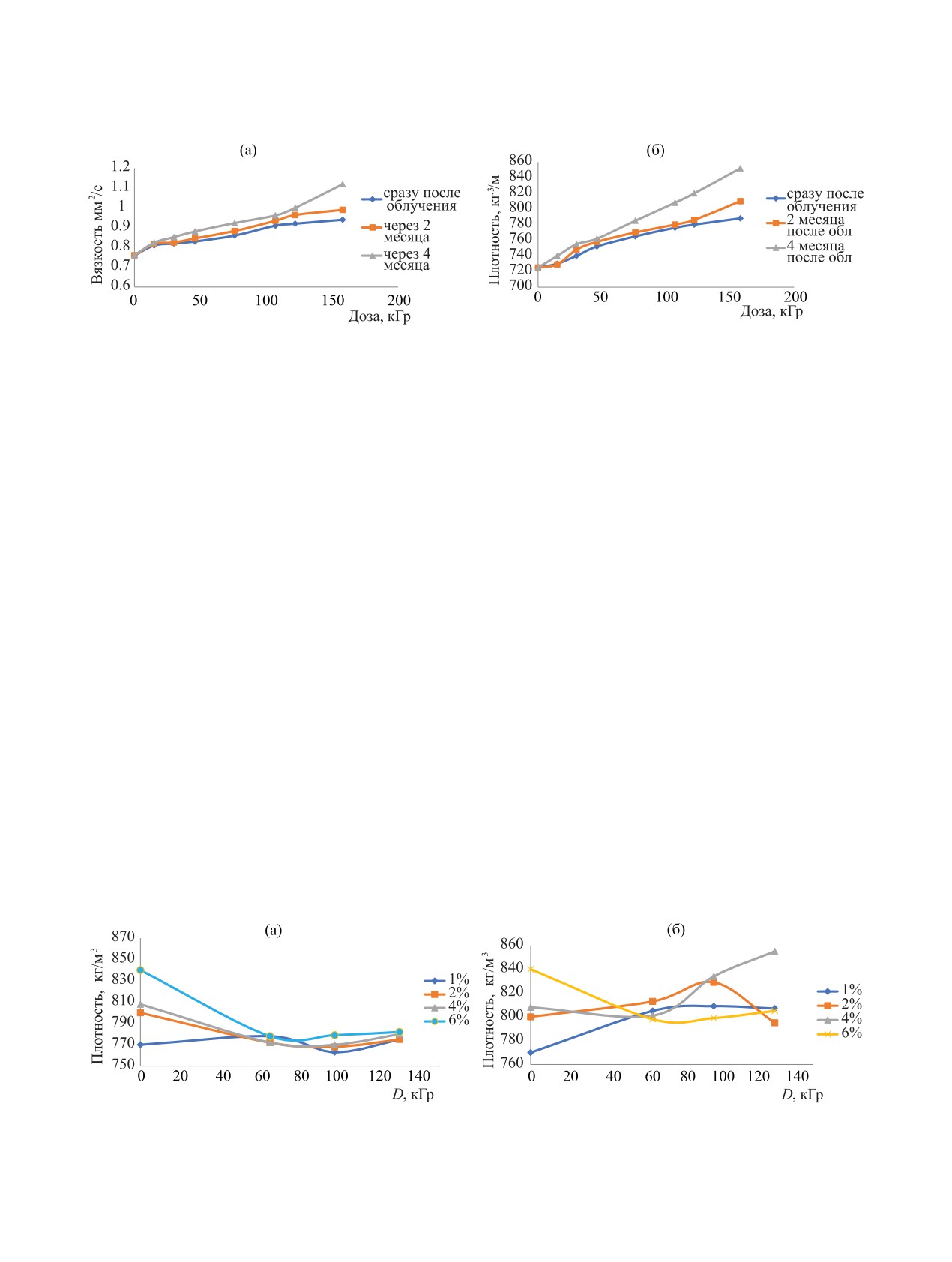 of density and viscosity of samples before and after irradiation at different absorbed doses are presented. The