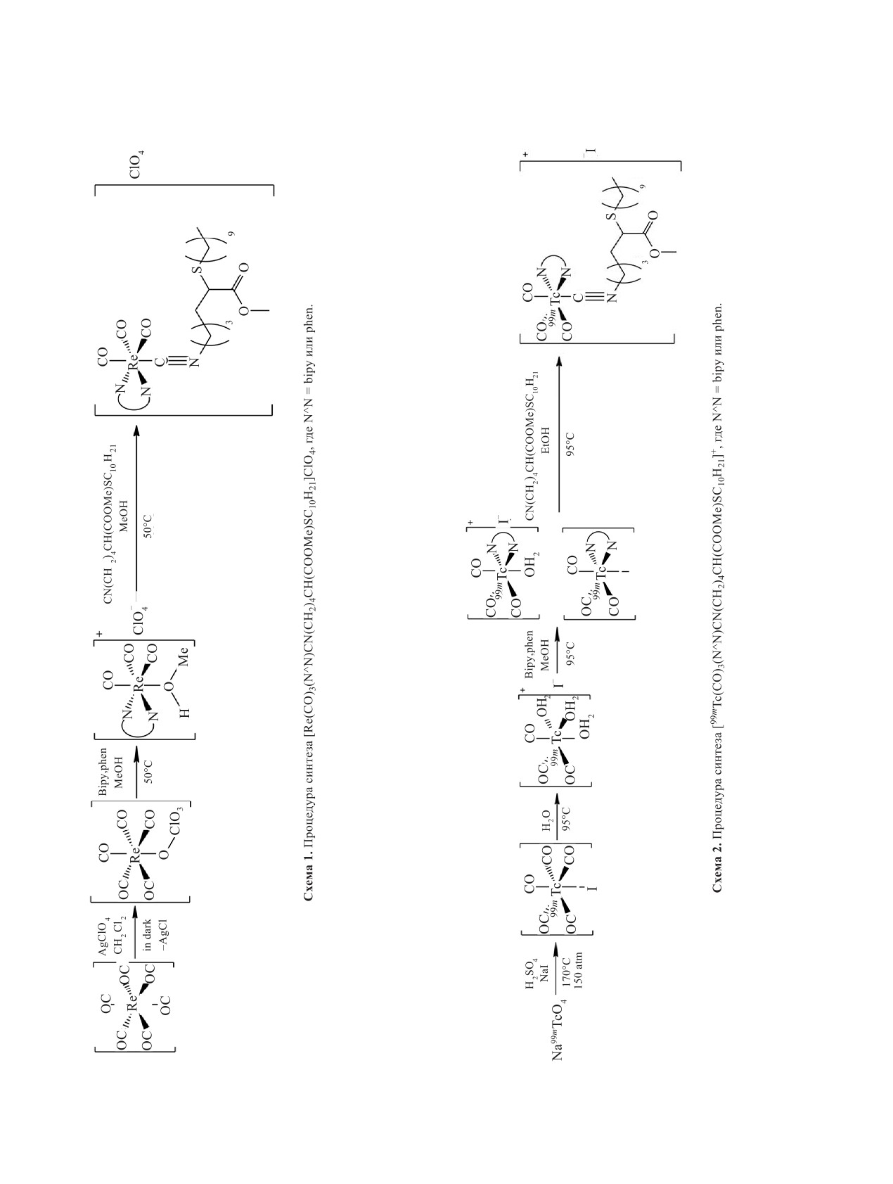 M = 99mTc или Re, N^N = 2,2'-бипиридин (bipy) или 1,10-фенантролин (phen), получены по реакции