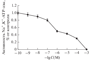 Изменение активности Na+,K+-ATP-азы при действии разных концентраций уабаина. Представлены среднеарифметические значения и значения стандартной ошибки, полученные в трех независимых экспериментах. Исходное значение активности принято за 1.