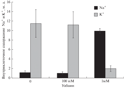 Действие уабаина на внутриклеточное содержание Na+ и K+ в первичной культуре нейронов мозжечка крыc. Клетки инкубировали в присутствии и в отсутствие 100 нМ и 1 мМ уабаина в течение 3 ч. Внутриклеточное содержание ионов выражено в м.д. Представлены среднеарифметические значения и значения стандартной ошибки, полученные в трех независимых экспериментах.