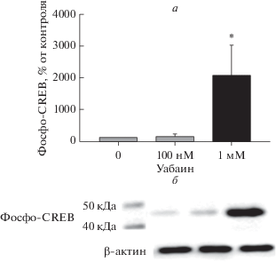 а – Влияние уабаина на активацию CREB в клетках первичной культуры нейронов мозжечка крыс. К культуре клеток добавляли уабаин в концентрации 100 нМ или 1 мМ и инкубировали в течение 3 ч. Исходный уровень фосфорилирования CREB в клетках принят за 100%, данные представлены как среднеарифметические значения и значения стандартной ошибки, полученные в четырех независимых экспериментах. б – Вестерн-блот фосфо-CREB (Ser133) и β-актина в образцах после 3 ч инкубации нейронов с уабаином.