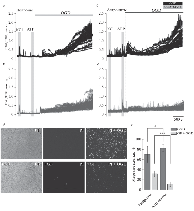 Нейропротекторное действие 24-часовой инкубации клеток гиппокампа с 3 мкМ агониста α2-адренергических рецепторов гуанфацина (GF). Ca2+-сигналы нейронов и астроцитов во время 40-минутной OGD в контроле (а, б) и после 24-часовой инкубации с 3 мкМ агониста α2-адренергических рецепторов гуанфацина (в, г). Представлены Са2+-сигналы клеток в одиночных экспериментах, полученные с использованием одной и той же клеточной культуры. д – Изображения клеточной культуры гиппокампа в проходящем свете (BF), канале регистрации флуоресценции иодида пропидия (PI) до начала эксперимента и после 40 мин OGD (PI+OGD). Белые точки представляют собой окрашенные PI ядра исключительно некротических клеток. е – Усредненное количество окрашенных PI клеток, погибших вследствие OGD-индуцированного некроза в нейронах и астроцитах гиппокампа в отсутствие гуанфацина (OGD) и после 24-часовой инкубации с 3 мкМ гуанфацина (GF+OGD) (% ± SE). * – Различия статистически значимы, р = 0.009; *** – различия статистически значимы, р ≤ 0.001. Кратковременные аппликации 35 мМ KCl и 10 мкМ ATP применяли для выявления нейронов и астроцитов соответственно.