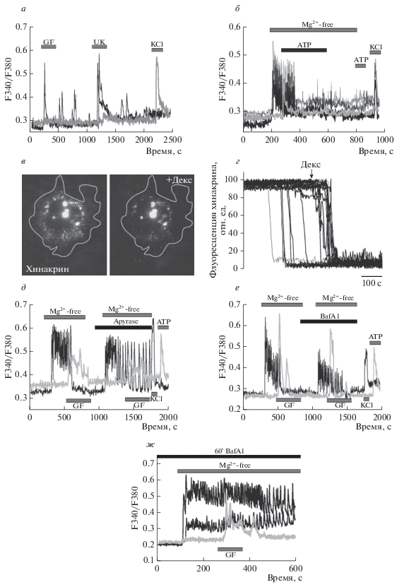 TIRF-микроскопия. Для визуализации и исследования динамики секреции ATP-содержащих везикул в астроцитах, окрашенных хинакрином, применяли метод TIRF-микроскопии. Для этого использовали инвертированный TIRF-микроскоп (IX71, Olympus, Япония), оснащенный иммерсионным масляным объективом с высокой числовой апертурой (60×/1.65 NA) и высокочувствительной охлаждаемой камерой высокого разрешения (Hamamatsu, Япония). Серии изображений получали и анализировали с помощью пакета программ Olympus Cell^tool software (Olympus). Флуоресценцию хинакрина возбуждали с помощью аргонового лазера при длине волны 488 нм, регистрацию производили в диапазоне 500–530 нм. Для оценки изменений интенсивности флуоресценции выбирали область интереса (ROI), в которой отмечались флуоресцирующие гранулы, содержащие ATP. Снижение интенсивности флуоресценции в области интереса свидетельствовало о секреции везикул во внеклеточное пространство. Эксперименты проводили при 37°С.