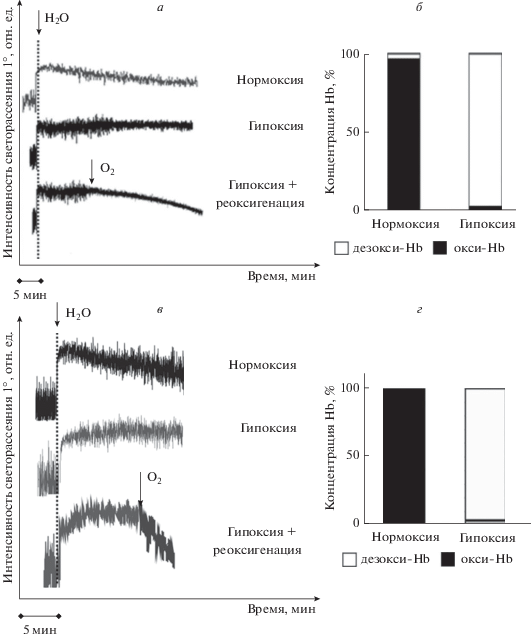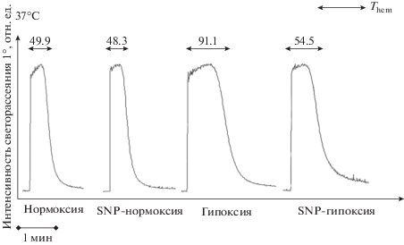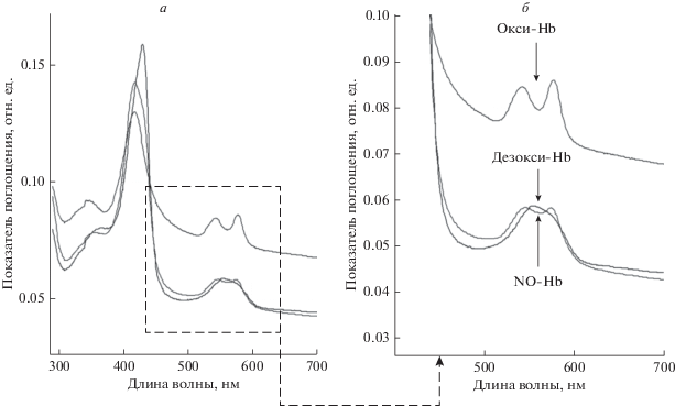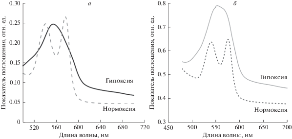 Гипоксия. Гипоксию создавали дегазированием суспензии аргоном в течение 15 мин. Содержание кислорода контролировали с помощью кислородного датчика mini-Oksik 3 (“Аналитика-Сервис”) в гипоксической камере (Billups Rothenberg), спектры Hb контролировали в диапазоне сканирования 300–700 нм. Во время измерения спектров кювету запечатывали герметизирующей пленкой для сохранения гипоксических условий.