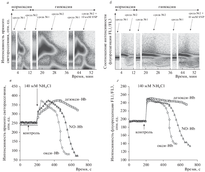 Гемолиз в изотонической аммонийной среде ингибируется в гипоксических условиях (метод проточной цитометрии). Исследование проводили на проточном цитометре в режиме TIME. Эритроциты (2 × 106 кл/мл), инкубированные с 5 мкМ BCECF-AM 30 мин, помещали в изотонический буфер (среда № 1, pH 7.4) – контроль, в изотоническую аммонийную среду (среда № 2, pH 7.4) – 140 мМ NH4Cl. Опыт повторяли для трех конформаций Hb: в условиях нормоксии (окси-Hb, R-форма Hb), в условиях гипоксии (дезокси-Hb, T-форма Hb), в условиях гипоксии с добавлением донора NO – SNP (NO-Hb, R-форма Hb). а – Изменение интенсивности прямого светорассеяния, отражающее изменение объема клеток; б – соотношение интенсивностей флуоресценции FL1/FL3, отражающее изменение pHi. а, б – Репрезентативный эксперимент на проточном цитометре; в, г – оцифровка данных приведенного эксперимента с помощью Cytometry List Mode Data Aquisition&Analysis Software; а, в – данные прямого светорассеяния отражающие изменение объема клеток; б, г – соотношение интенсивностей флуоресценции FL1/FL3, отражающее изменение pHi.
