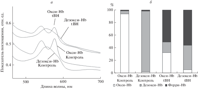 Предварительно был проведен спектральный анализ форм Hb в условиях нормоксии и гипоксии (окси-Hb, дезокси-Hb) и при ОС, индуцированном трет-бутил-гидропероксидом (tBH, 1.5 мМ) (окси-Hb – tBH, дезокси-Hb – tBH) (рис. 6а). В результате расчета содержания ферри-форм Hb (Fe(III), Fe(IV)) по методу Benesch и соавт. [31] было выявлено, что процент образования ферри-Hb при ОС в условиях нормоксии составляет 50.7 ± 13.9, n = 7 (окси-Hb – tBH) и в условиях гипоксии – 57.2 ± 12.6, n = 7 (дезокси-Hb – tBH) (рис. 6б).